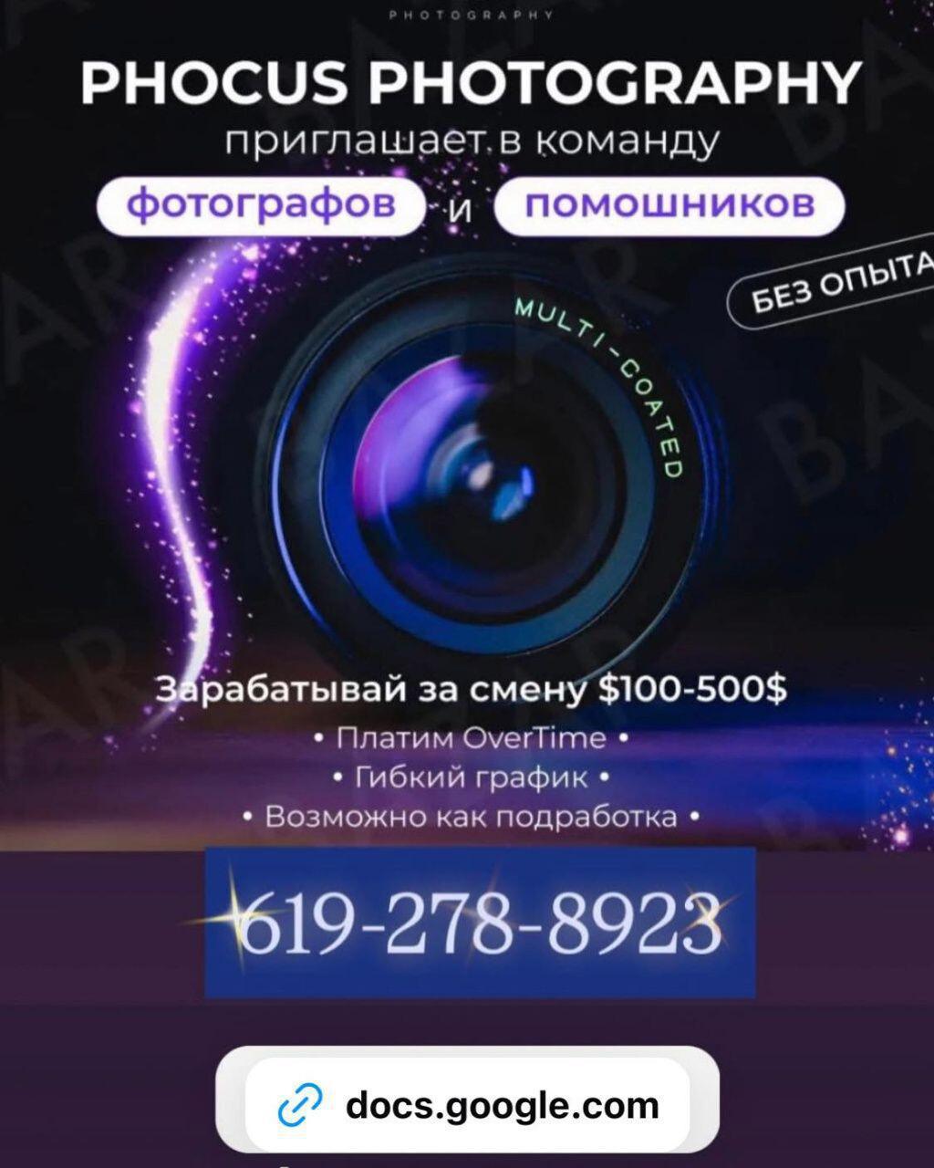 👉 В связи с расширением PHOCUS PHOTOGRAPHY вакансия фотограф и ассистентов (можно без опыта) в Нью Йорке и Нью-Джерси! Зарплата : - Фотограф ($100-$600 за смену) - Помощник ($115 за 7 часов + овертаймы оплачиваються) Рабочий график - Четверг - Пятница -...