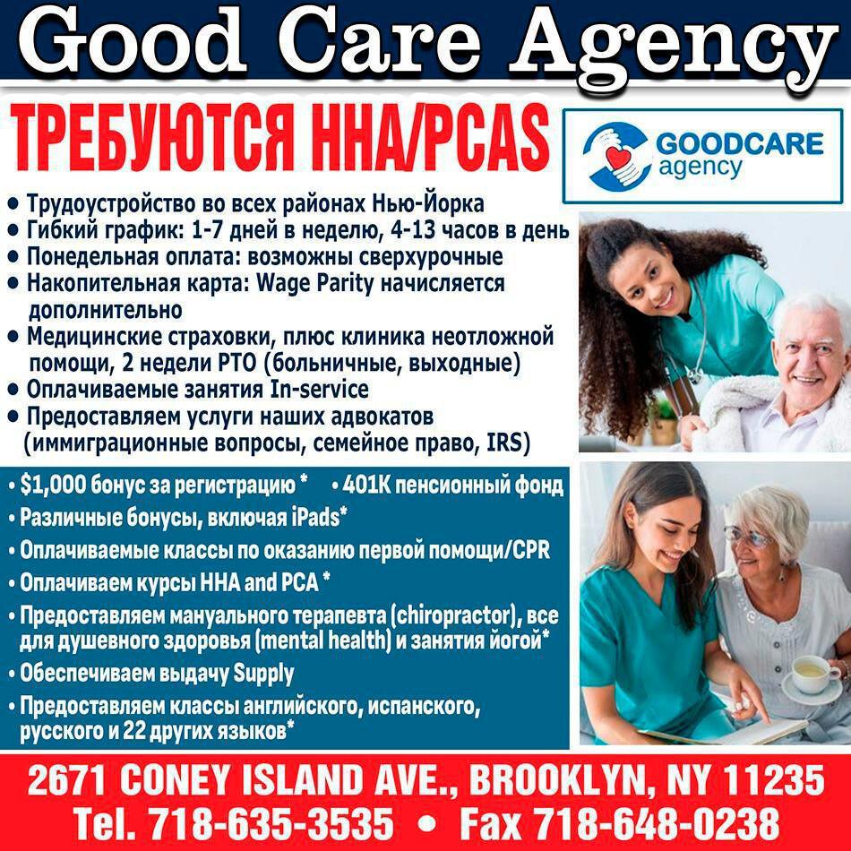 👉 Good Care Agency Требуются HHA/PCAS • Трудоустройство во всех районах Нью-Йорка • Гибкий график: 1-7 дней в неделю, 4-13 часов в день • Понедельная оплата: возможны сверхурочные 718-635-3535 • 718-648-0238 ...